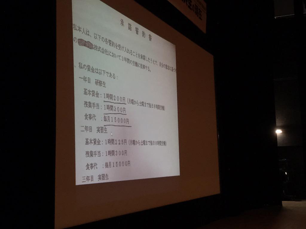 安田さんが入手した、東海地方の縫製工場の外国人実習生の契約書。時給200円の奴隷労働です。経営者に問うと「何で外国人に日本人と同じ待遇しなきゃいけないの?」と素でびっくりする、と。