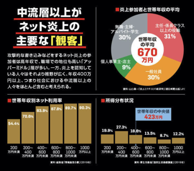 熱い情報の発信に熱心な人は全体の92%前後で、日本では現在、ネットユーザーは1億人以上に達しています。その中で、家庭の年収400万円以上の中流層のネット利用率は非常に高いです。