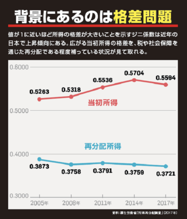 日本では、経済の不平等を表す指標であるジーニ係数が長期的に上昇傾向にある。