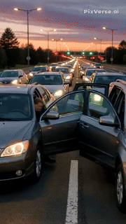 渋滞するクルマからドライバーが次々と降り、前方の信号無視の小学生に腕組み。